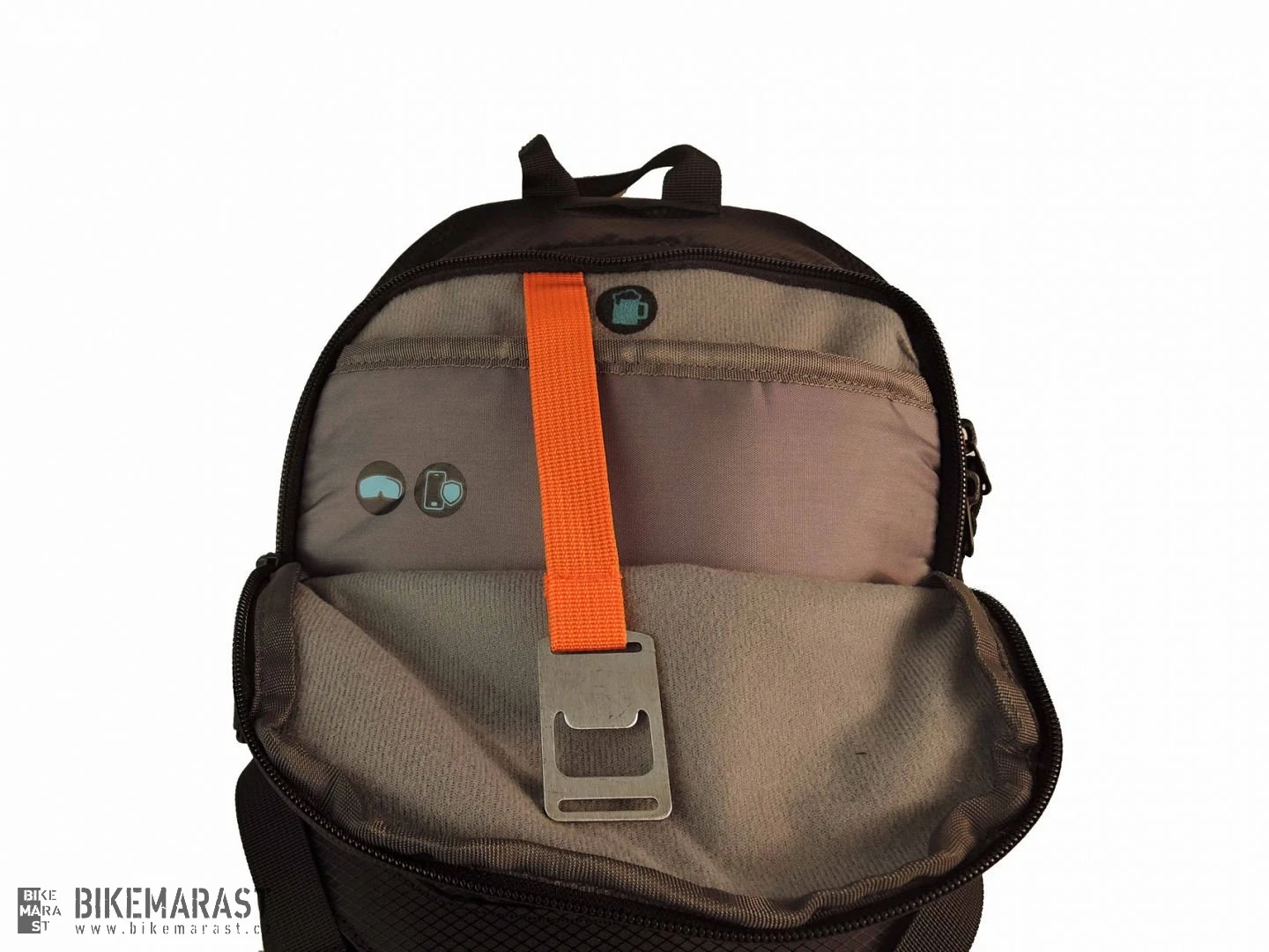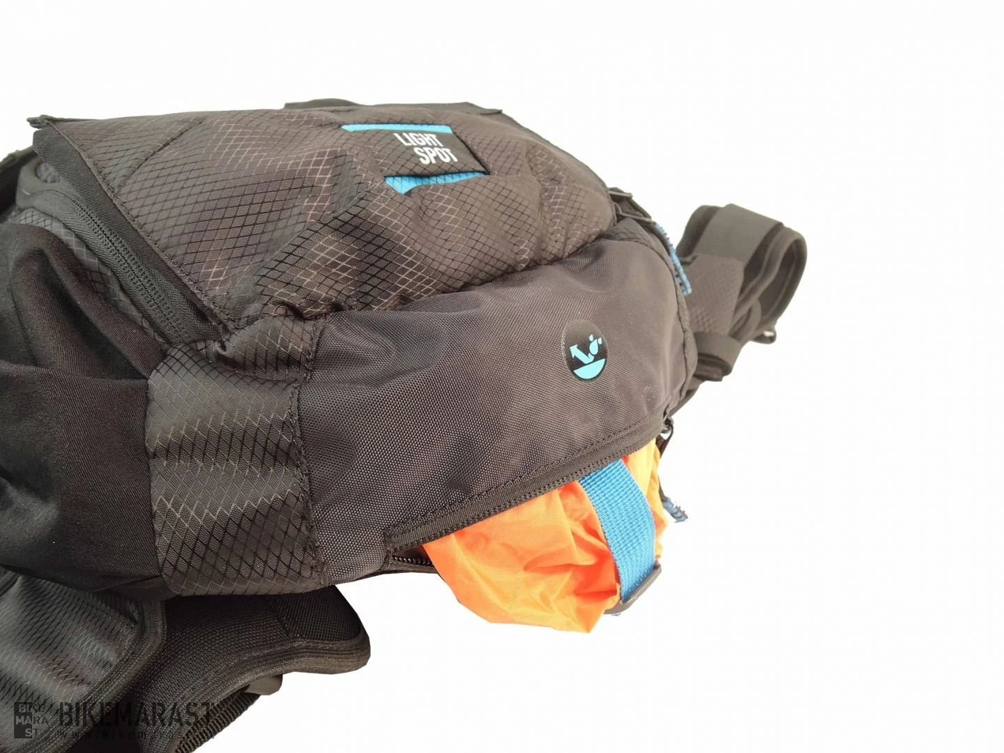 Další vychytávky batohu: kapsa a poutko na vodní rezervoár, integrovaná pláštěnka ve svítivě oranžové barvě s velkým reflexním logem, systém uchycení přilby k batohu (lze také upevnit integrálku). Spousta kapes (vnější kapsy dvojcestné zipy) a kapsiček na nářadí, pumpu, doklady, klíče...........speciální vyměkčené kapsy na telefon a brýle. Reflexní prvky, poutko na blikačku a překvapení pro pány :o)