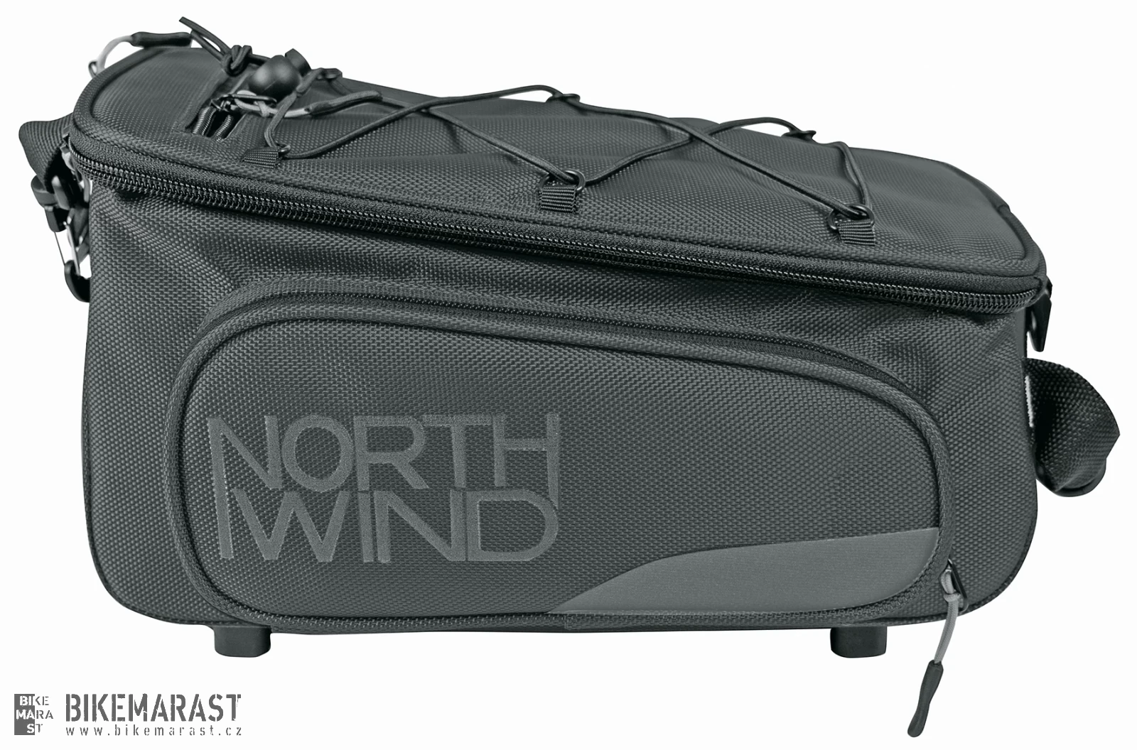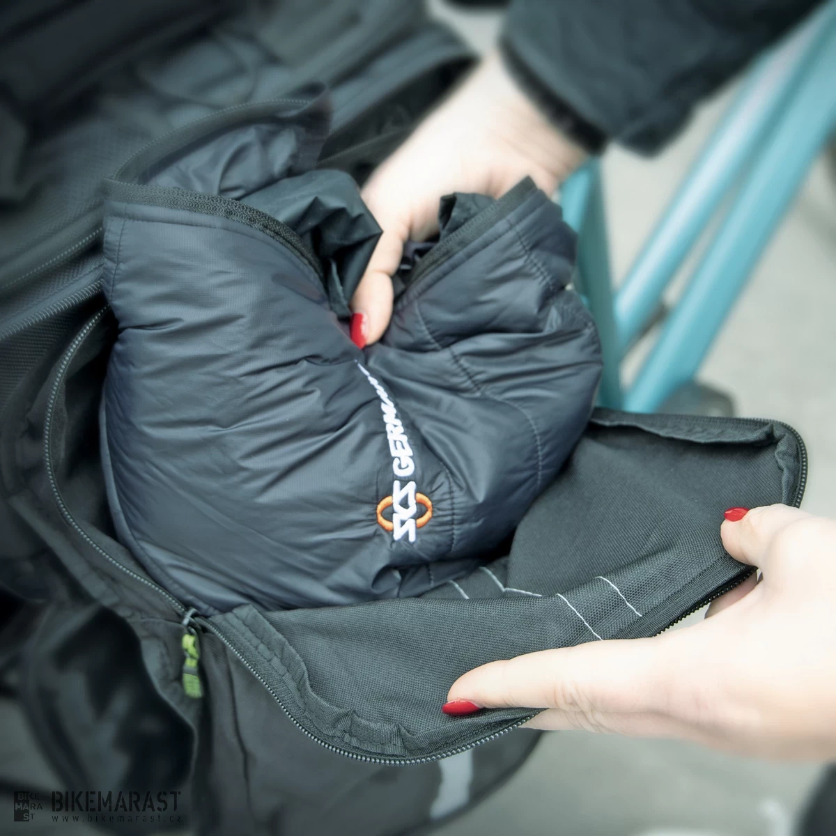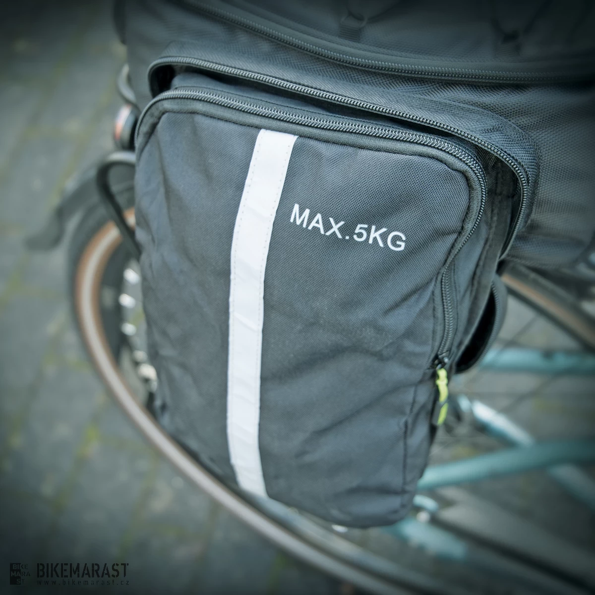 Brašna s vyklápěcími bočními kapsami. Úložná kapsa z elastické síťoviny umožňuje převážet další zavazadla. Přihrádka na zip v horní části tašky poskytuje rychlý přístup k telefonu, klíčům a penězům. Pláštěnka udrží tašku a obsah v suchu, zatímco reflexní prvky na voděodpudivé nylonové tkanině zajišťují viditelnost ve tmě.