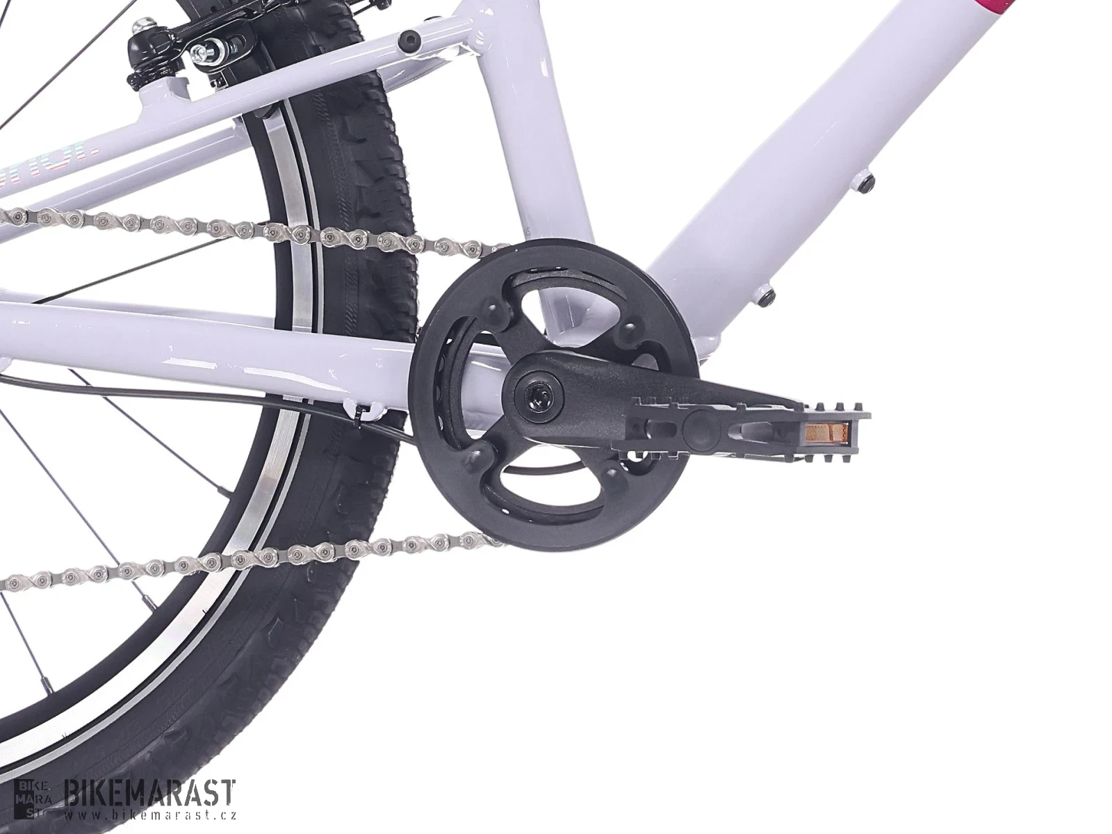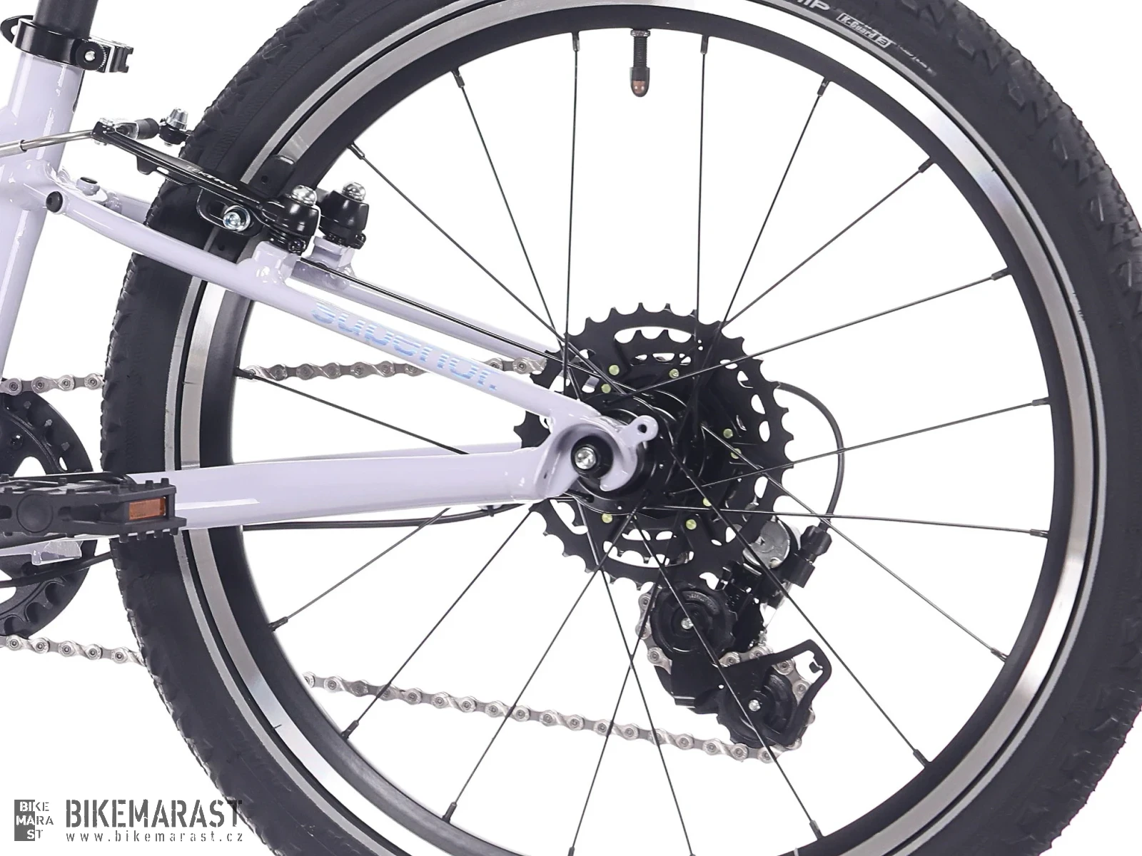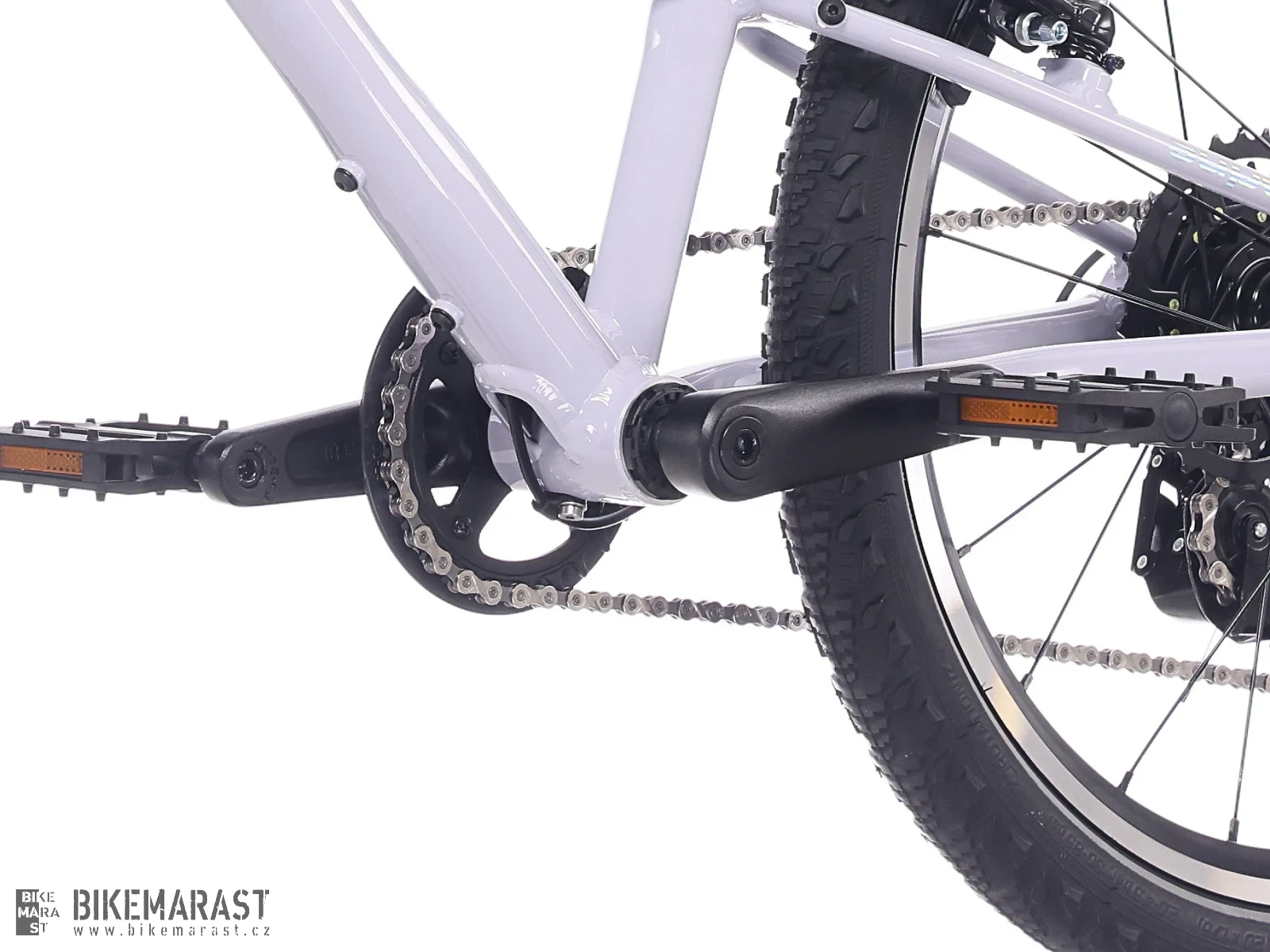 - Komponenty pro lepší ovladatelnost: kratší kliky, užší řídítka, dětské gripy a dobře dosažitelné brzdové páky pomáhají dětem řídit kolo přirozeně a bez námahy.