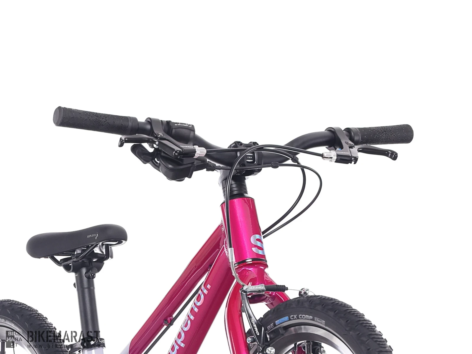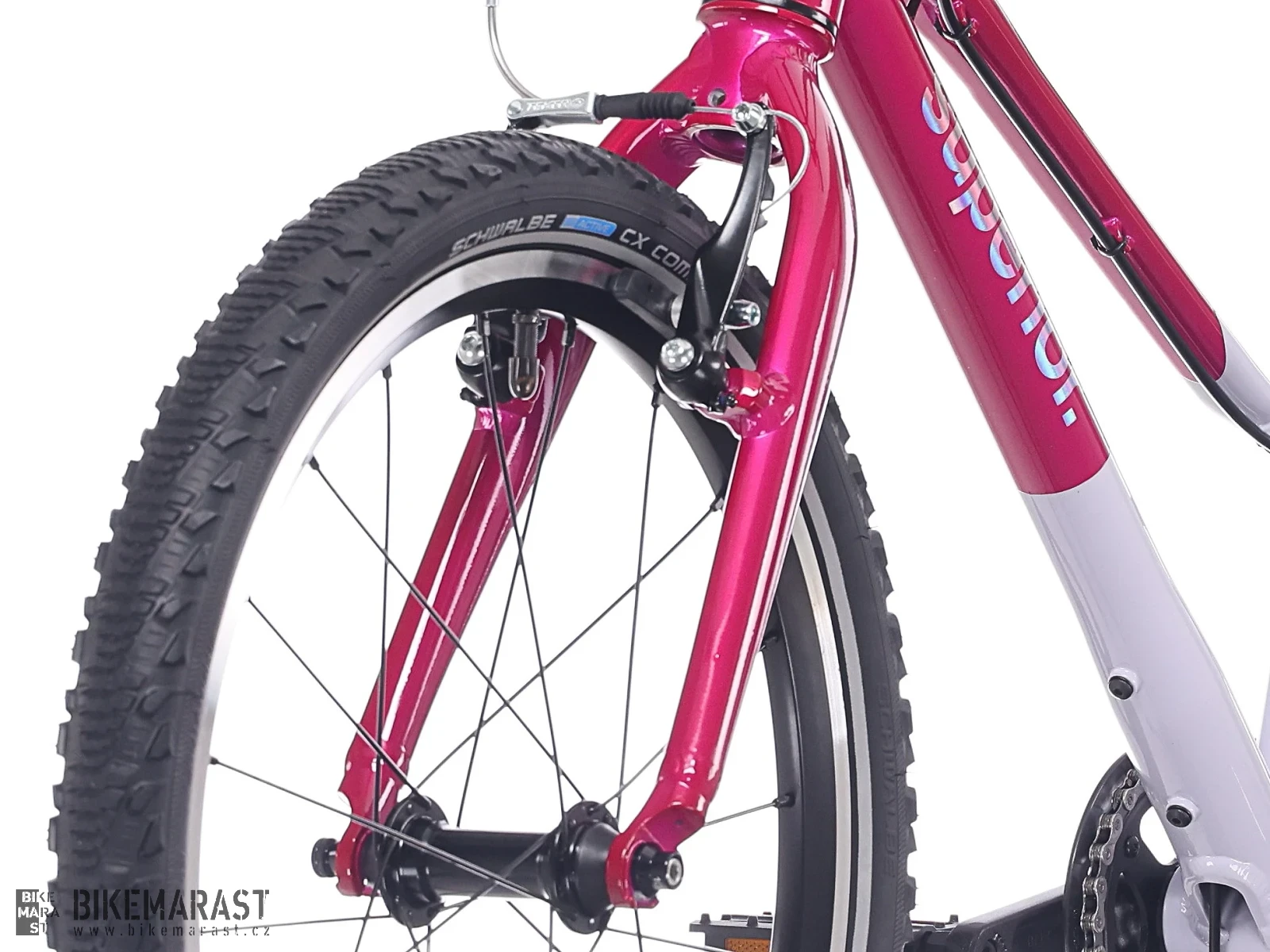 - Dětem přizpůsobené V-brzdy Tektro: lehký chod páček a citlivá modulace zajišťují bezpečné brzdění i pro malé ruce.