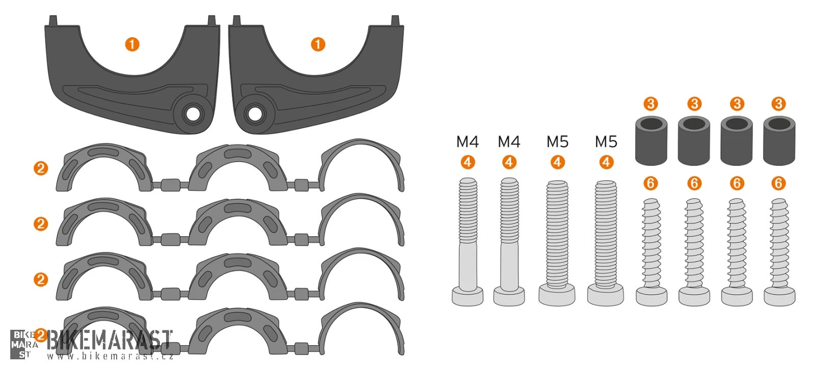 - Sada se skládá ze čtyř gumových vložek do upínací objímky, dvou nových spodních částí objímky, čtyř distančních podložek a příslušných šroubů.