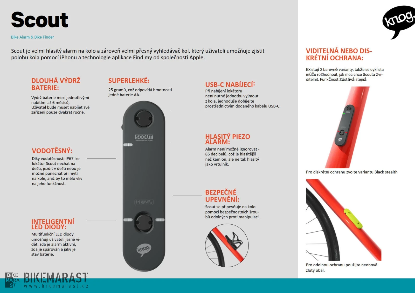 KNOG Scout je lehký a nízkoprofilový lokátor a alarm pro jízdní kola navržený tak, aby se bez problémů integroval do sítě produktů FindMy od Apple, a umožňuje sledovat, kde se kolo nachází, i když není zrovna v pohybu. Připevnění je diskrétní a bezpečné pod jakýkoli košík na láhev pomocí dodávaných bezpečnostních šroubů. Zařízení se dobíjí přes USB-C a při běžném používání vydrží v provozu přibližně 6 měsíců. Cyklisté mohou aktivovat/deaktivovat alarm citlivý na pohyb, lokalizovat zařízení a kontrolovat výdrž baterie prostřednictvím aplikace Knog.