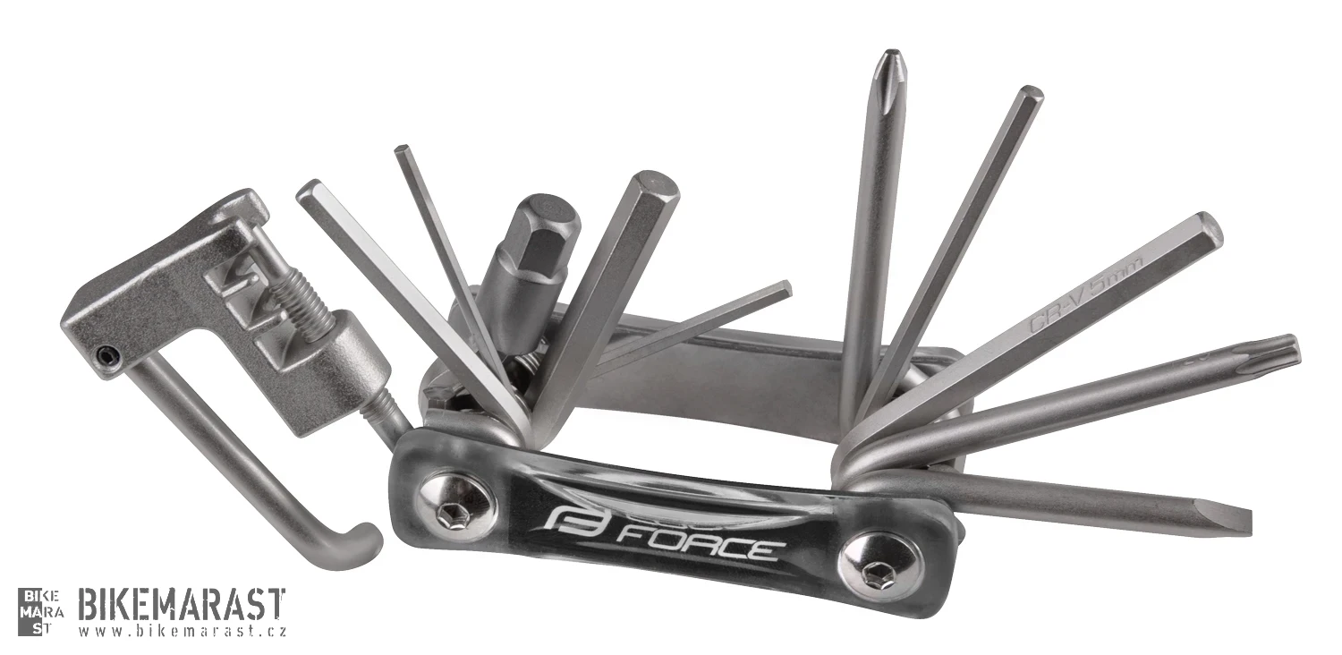 - 7x inbus 2 / 2,5 / 3 / 4 / 5 / 6 / 8 mm, 1x šroubovák křížový PH2, 1x šroubovák plochý, 1x torx klíč T25, nýtovač řetězu 6-11r., klíč na galuskový ventilek v těle nýtovače