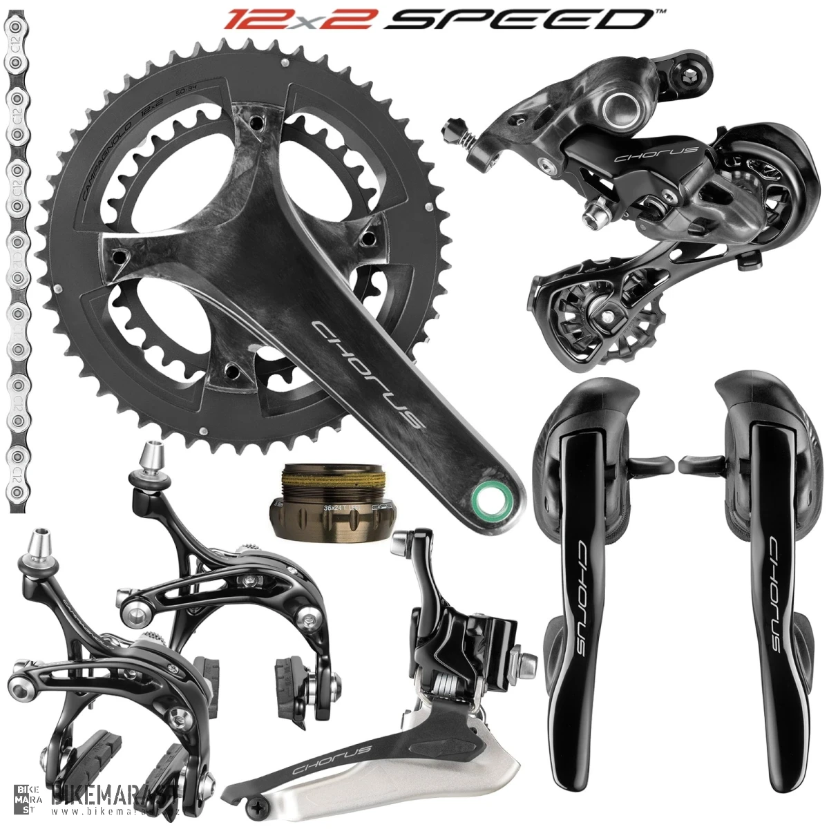 Sada CHORUS 12x2 obsahuje v základní sestavě následující komponenty: přehazovačku se středním vodítkem, přesmykač (navářkový), řazení (včetně kompletní kabeláže), řetěz 12s, kliky s Cr-Mo osou, středové misky (BSA závitové) a brzdové čelisti Dual-Dual.