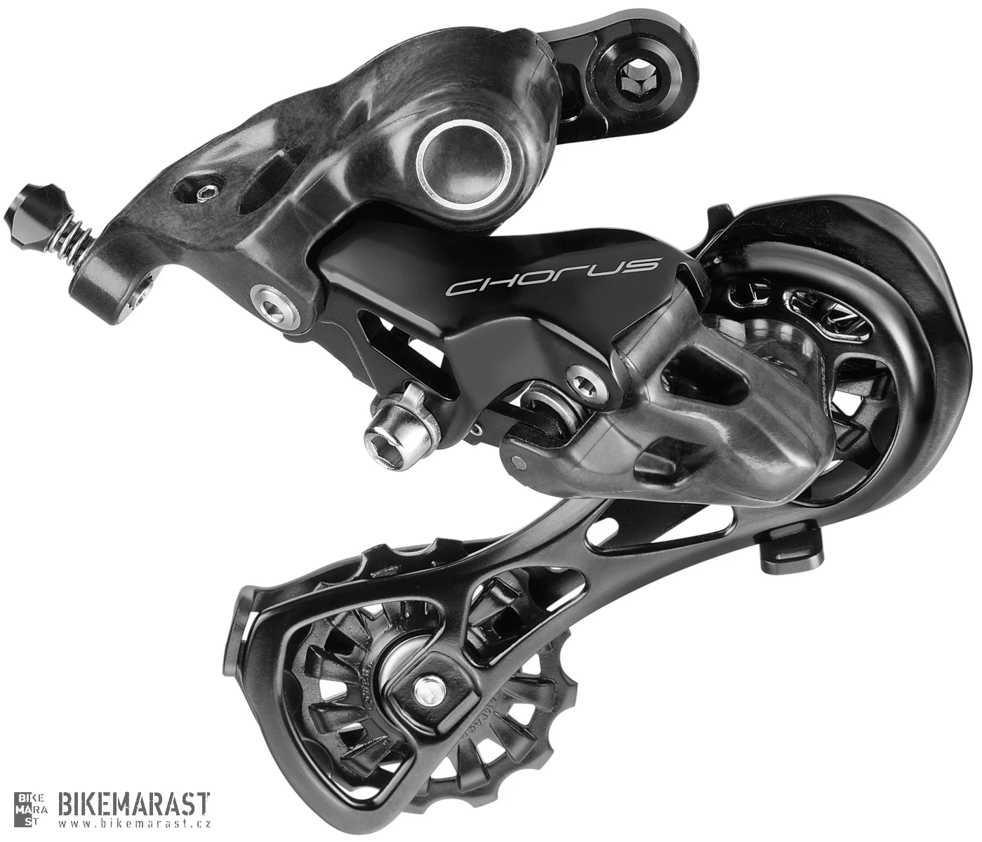PŘEHAZOVAČKA Chorus™ 12x2 je tou nejpřesněji, nejrychleji a nejjemněji řadící přehazovačkou, kterou firma Campagnolo kdy vyrobila. Zcela nový tvar paralelogramu přehazovačky s použitím tzv. 3D EMBRACE technologie zajišťuje přesnější a jemnější řazení s nižší energetickou ztrátou což zároveň prodlužuje životnost komponentu. Přepracovaný paralelogram přehazovačky umožňuje udržení identické vzdálenosti vrchního ozubeného kolečka přehazovačky vůči jednotlivým pastorkům tj. přehazovačka přesně kopíruje kazetu, čímž je docíleno výrazně přesnějšího řazení na všech pastorcích. Zcela přepracovaný byl také tvar vodítka, které je nově osazeno většími kladkami, které napomáhá již tak skvělému projevu řazení. Vrchní kladka se od spodní odlišuje výrazně delšími zuby, které napomáhají k udržení přesné pozice řetězu vůči kazetě. Vodítko je dimenzováno pro kazetu s největším pastorkem 34 zubů. Nově přidaná kompenzační pružinka do vrchní části paralelogramu eliminuje vibrace a zajišťuje tak bezchybné řazení na všech typech povrchů.