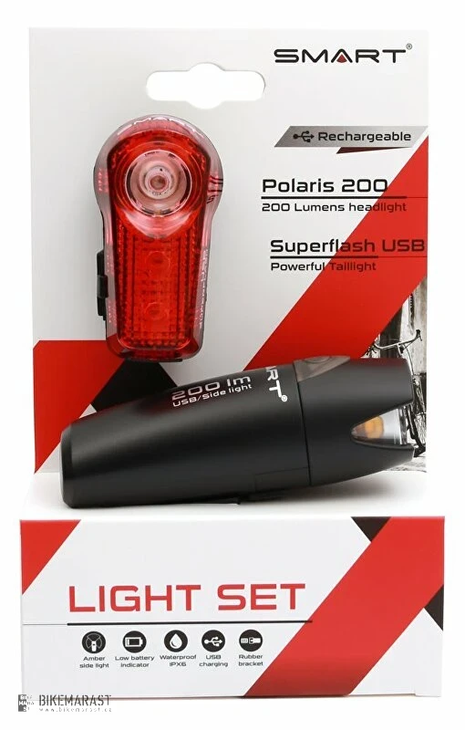 Atraktivní dobíjecí sada osvětlení, od prémiového výrobce osvětlení: fy. SMART. Vhodná pro MTB, turistiku, sport i městská a turistická kola. Dokonalá technologie, nejkvalitněší zpracování, přesné těsnící prvky jsou použity v každém výrobku fy. SMART. Výrobek se vyznačuje snadnou a rychlou montáží, vysokým výkonem, dlouhou životností. Přední světlo se vyznačuje vysokou intenzitou svícení a bezpečnostní "jantarovou zónou".