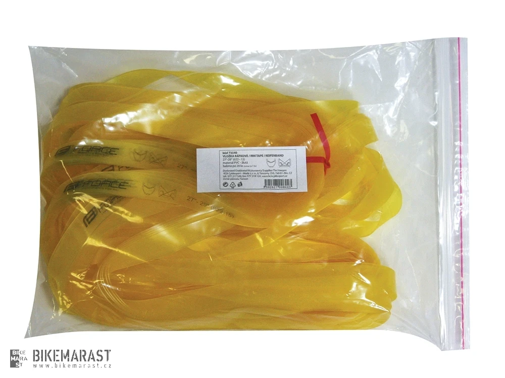 Internetová cena25 Kč21 Kč bez DPH Vložka ráfková FORCE 622x15 žlutá 28"-29" PVC - 20 ks