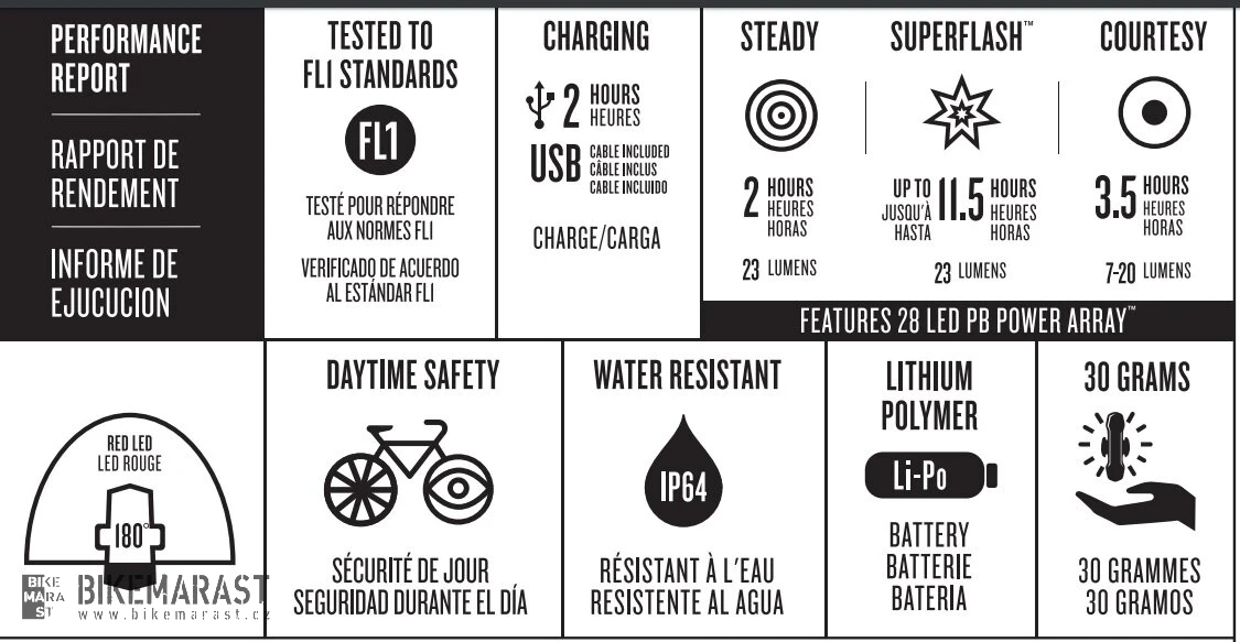 • blikačka má integrovaný LED čip s 28 COB LED s extrémní svítivostí a perfektní viditelností při extra nízké spotřebě energie